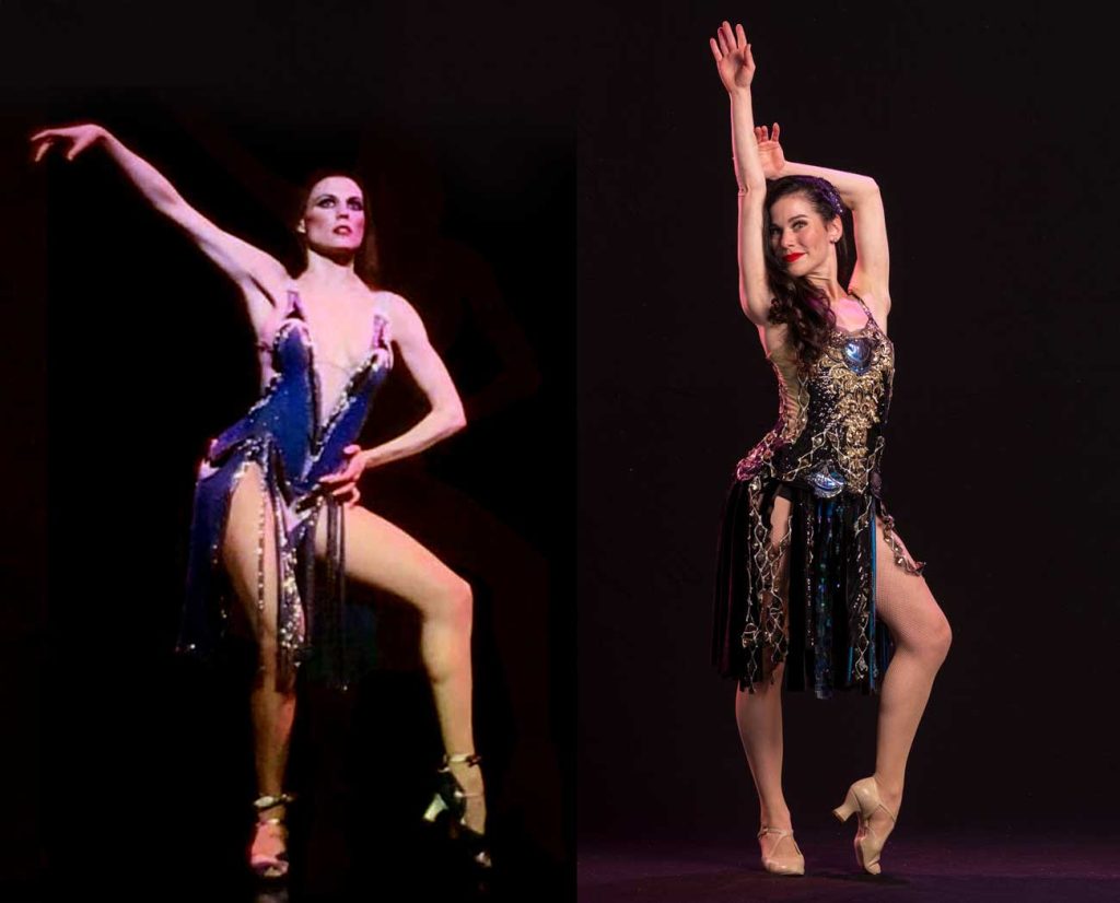 At left, Ann Reinking in her original 1978 “Trumpet Solo” costume; Deborah’s interpretation for Kelanie Murphy at right. Reinking herself gave Deborah the suggestion of using the “carwash-style” skirt, which looks solid when standing still but flares out in strips when the dancer moves.